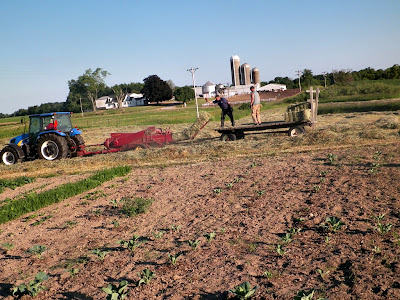 So, after keeping track of the new little addition and doing some gardening stuff and kitchen stuff, it was time for supper. I rang the dinner bell outside the back door and nobody came running. Saphira and I headed out the door to see where everybody was. The children were out in the barn playing in the new play house that their dad built for them, and Jonathon was down in the field with his tractor cleaning up some trees. Then he had a visitor, a cousin from around the corner, stop for a chat. I sent Diella down to tell her dad that supper was ready and after seeing the men, tractors, and their boys in the field, I thought I should take a picture. This is one reason we love living here so much. Family all around isn't always welcome in some families, but here, we delight in having unexpected visitors just stop by for a short chat. We have also rode our bikes and stopped by to see animals or other cousins with their animals practicing for fair. We stay busy here with stuff around the farm, but we also take time for leisure visits with family and friends.